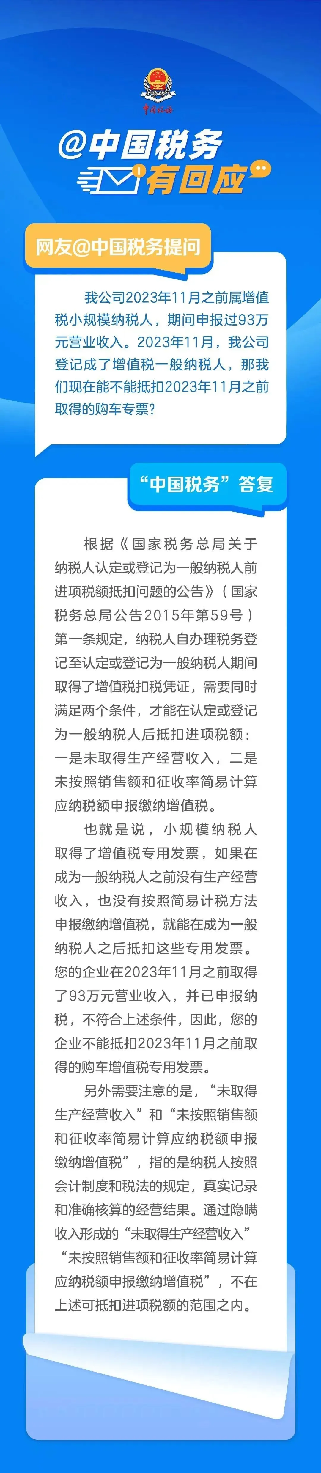 @中国税务有回应:登记为一般纳税人后,还可以抵扣之前取得的购车专票吗?